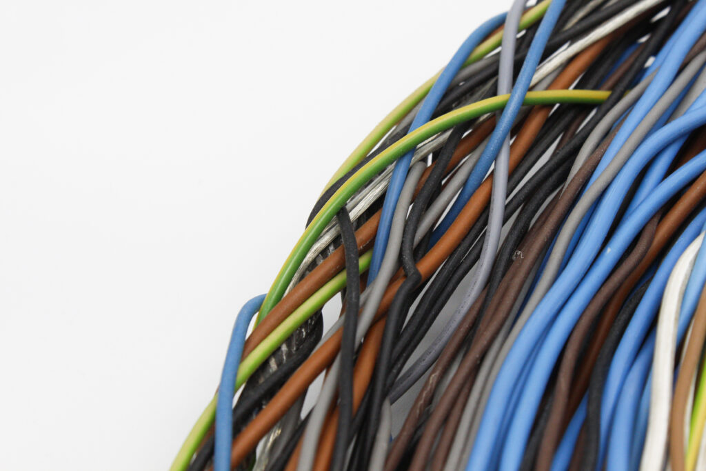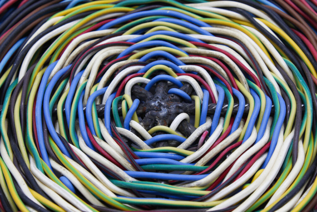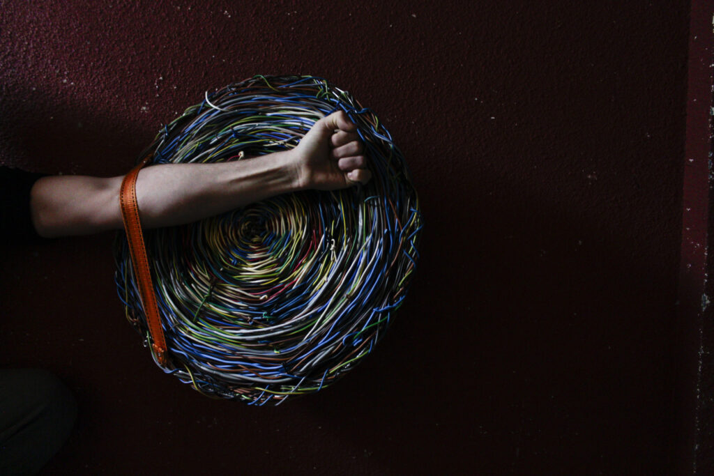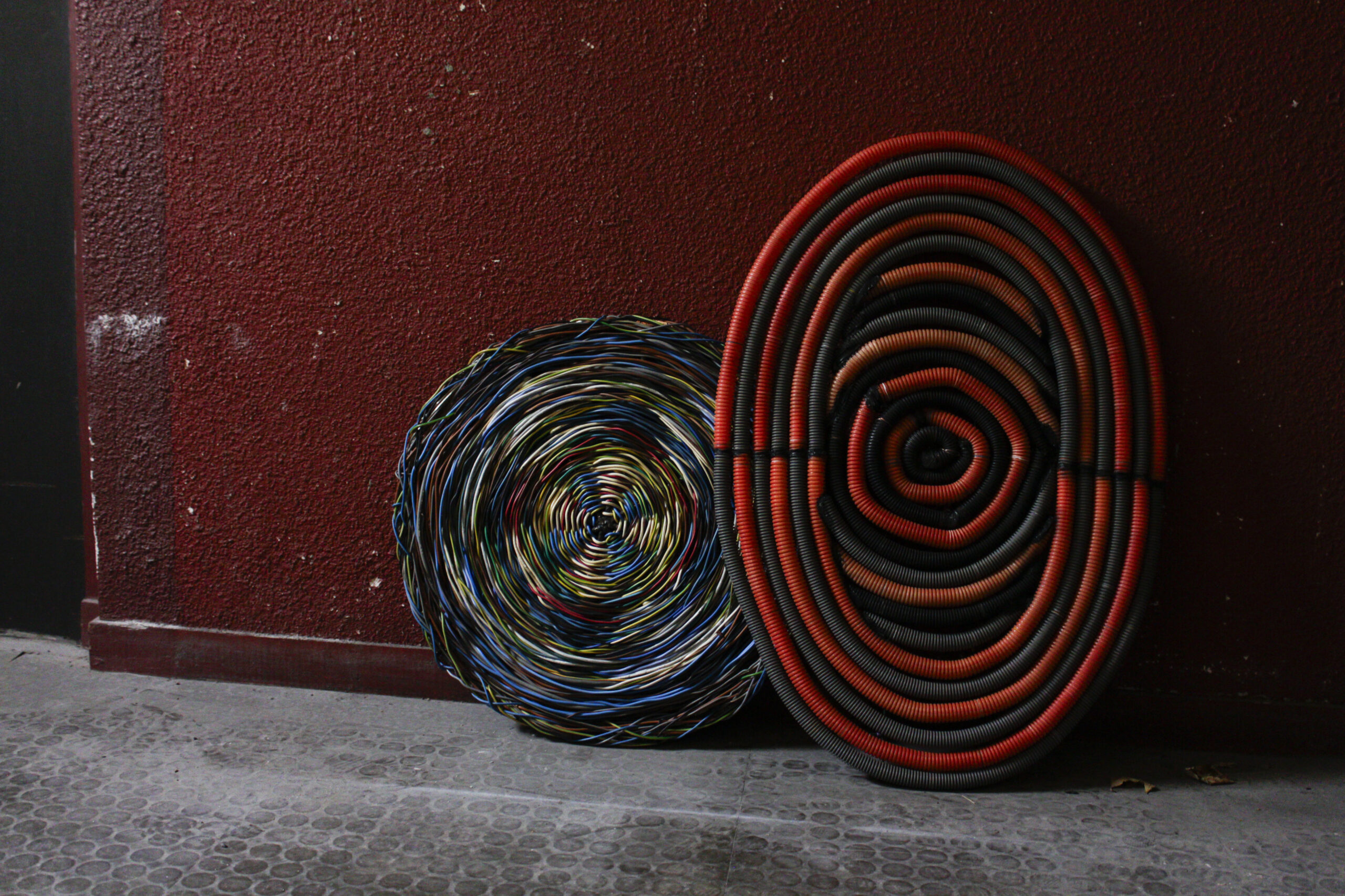 Bouclier tissé ; fer à béton, cable électrique, sangle.
