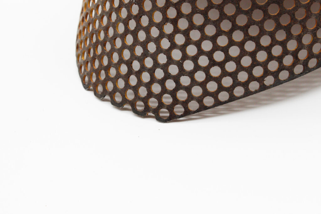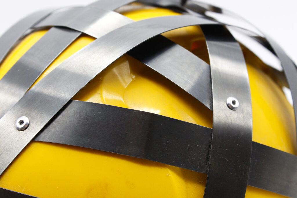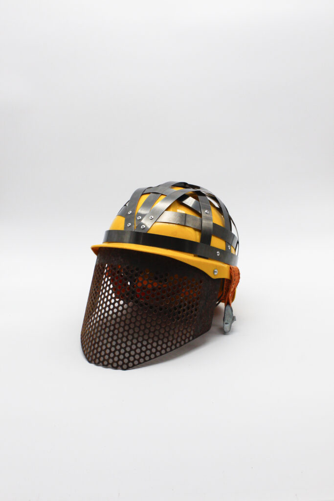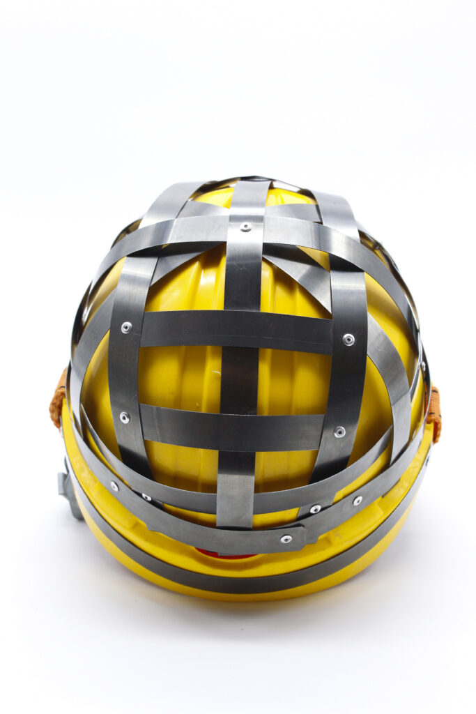 Casque renforcé ; casque de chantier, feuillard acier, tôle ajourée, sangle,30 x 21 x 22 cm.