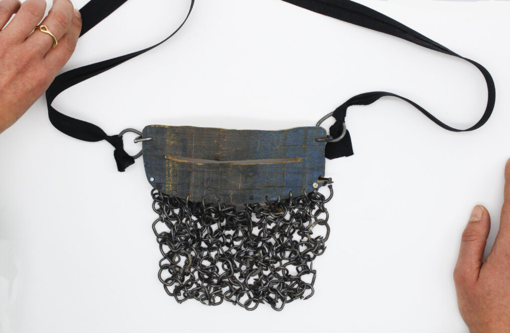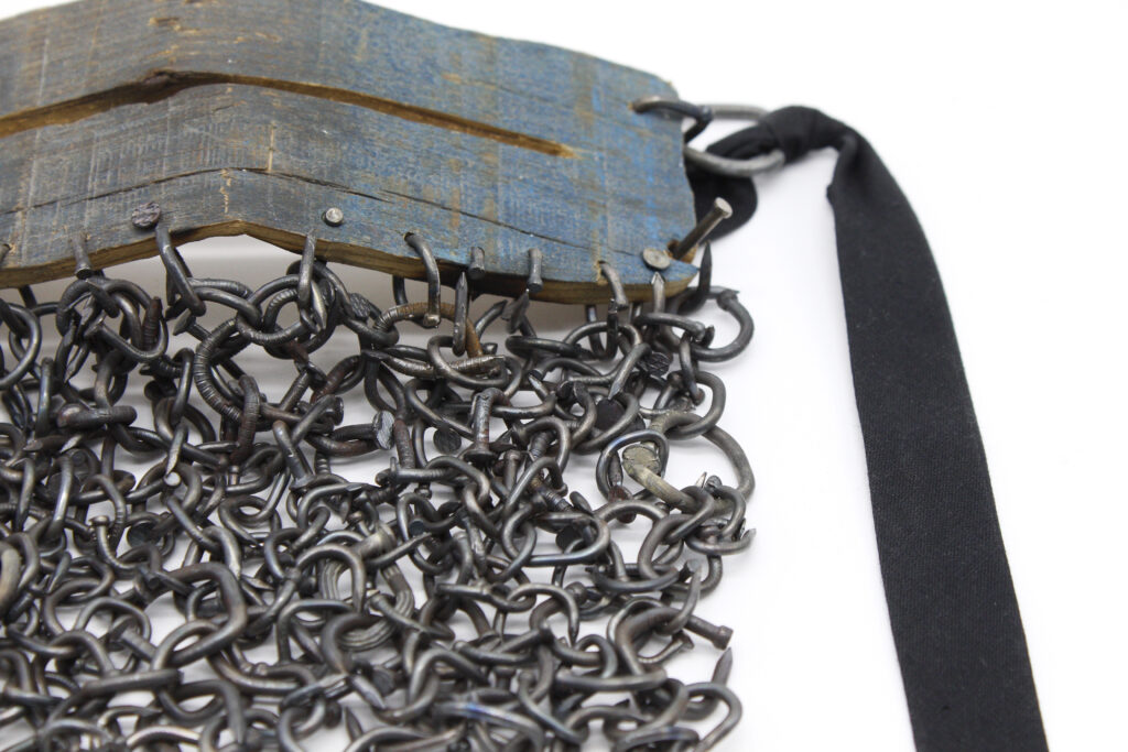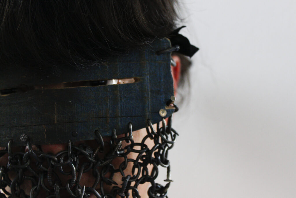 Masque Pare-éclat ; Bois de palette, clous, ruban.