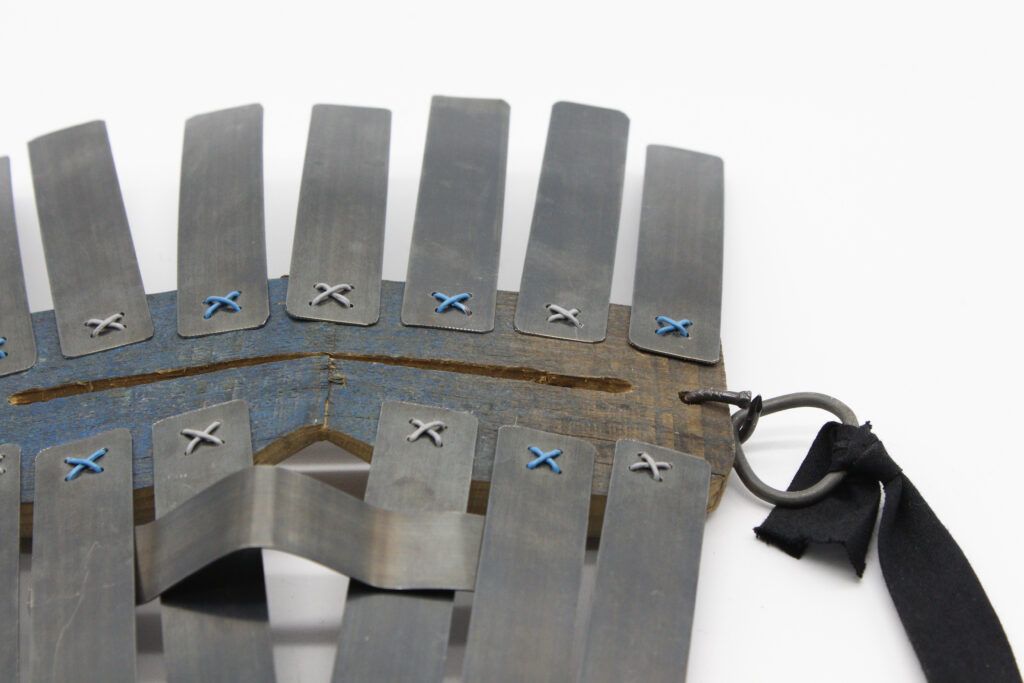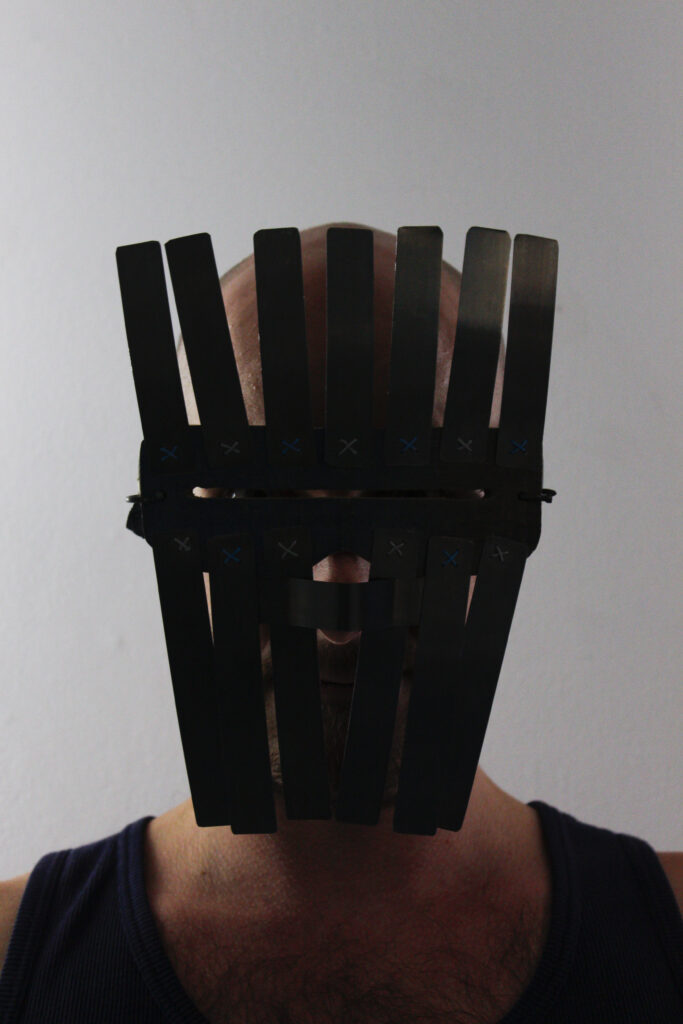 Masque Pare-éclat ; bois de palette, feuillard acier, fil électrique, ruban.